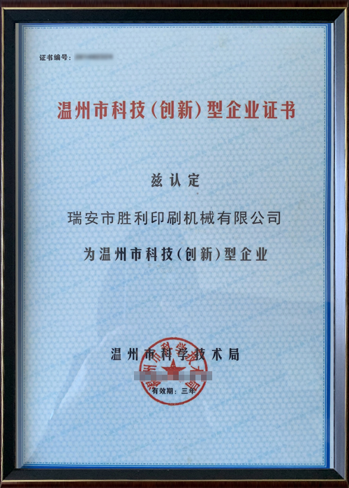 溫州市科技(創(chuàng)新)型企業(yè)證書